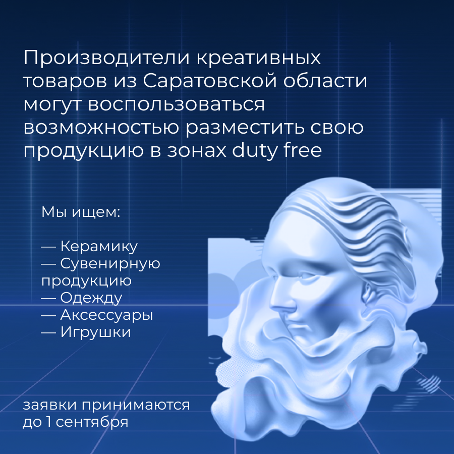 🔥 Производители креативных товаров из Саратовской области могут воспользоваться уникальной возможностью разместить свою продукцию в зонах duty free аэропортов Москвы, Санкт-Петербурга и Казани, а также в ресторанах Москвы и Санкт-Петербурга.